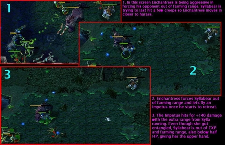 2.图2为魅惑魔女逼迫德鲁依出Farm有效范围,并在他开始后退时向他投掷“推进”。