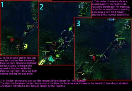3.图3中,你可以看见“推进”造成+160的神圣伤害,两个英雄之间的距离在“推进”投出后到命中目标几乎增加1倍,这同时也反映在“推进”造成的伤害上。