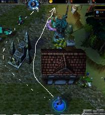 如图。如果牙去偷木,后有追兵,前有堵截,就可以用图中实线的W变向从中路逃跑。牙附近的房子不能穿过,但是卖复活的建主可以穿过。虚线为走路的路程,实线的路程要比虚线路程近的多。