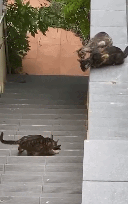 这么一堆猫咪就只有一只猫咪在努力的叼着小猫上墙,估计是嘴小没咬住,这小猫咪真是摔惨了。边上那两个你们真就光看着啊,就不能搭把手吗?