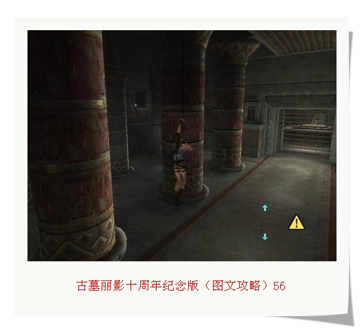展开来到一个大厅内全是柱子的地方。解决几个怪物后发现。前面的房间内有第三个神器。但房门是关着的。仔细看看四周的柱子发现有裂缝。在地板上拟好路线之后就开始跳了。现跳上右边的小台用第一个取得的神器开门后,下来。抬头看天花板,有个钩子。观察钩子前后左右的情况后。对路线也摸个八九不离十之后,就可以跳到左边台子开启。房门,得到第三个神器。