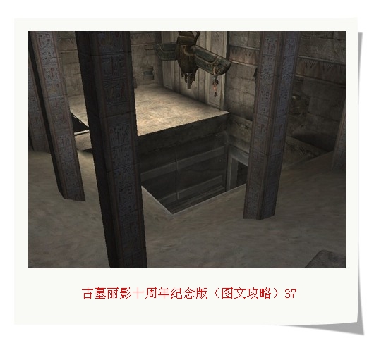 继续前进,到了一个中间有大立柱,柱子四面壁上有四零件,分别对应这狮身人面像中央大厅立柱的四样需要镶嵌东东。但是通往四壁的桥都是拉起的。让你看的到拿不到,干着急。看来还得一个个的放桥。第一个好拿,机关就在旁边的墙上。