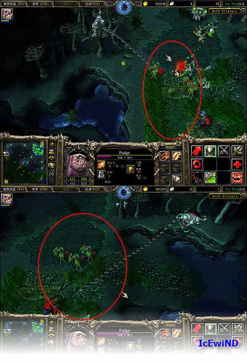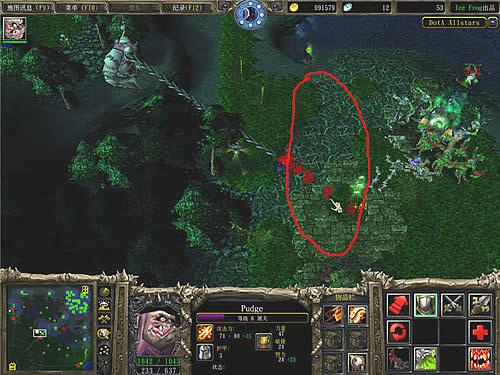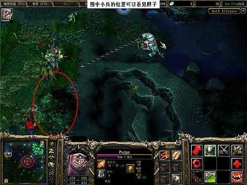 位置介绍:这就是上个里提到的那个河道,很常用的一个位置,不过小兵那个位置正好能看到我,如果最前边的兵在那棵树后,晚上视野是看不到的,但胖子可以钩到塔附近,对钩子等级要求也高,不过谁又会一开始站那去拉人,减肥吗?