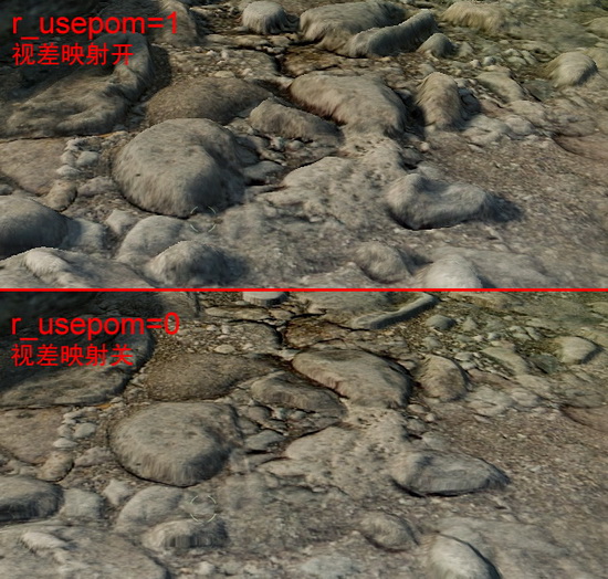 视差映射是在Very High下才会开启的,而当设定成高的时候,使用r_usepom=1将会开启视差映射,让地面的纹理更具立体感,以下是图片对比,它在有明显体现的时候对速度大概会有2FPS的影响,平时也没有什么影响,但会大大的提高游戏的YY度,我个人觉得是值得的。