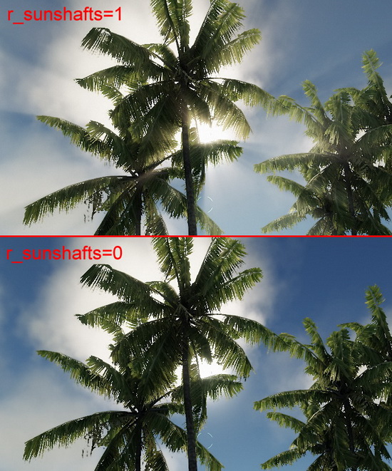 后期处理还包括阳光透过树叶间隙的光柱效果,这个是属于DX10 Very High效果,以下是开启和关闭的对比图,其对速度影响并不大,用户也可以在cfg里添加r_sunshafts=1来手工开启。