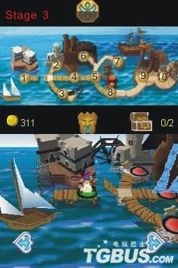 1.地图画面中的前方关卡被瀑布挡住,必须找到两个机械装置才能打开通道。选择上方的路线进入本关。