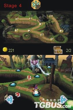 2.魔法师首先站在活动平台上,将上方的红色魔球击碎左边的石块,中途要躲避火焰的喷射,切换。