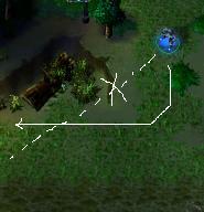 如图。如果牙去偷木,后有追兵,前有堵截,就可以用图中实线的W变向从中路逃跑。牙附近的房子不能穿过,但是卖复活的建主可以穿过。虚线为走路的路程,实线的路程要比虚线路程近的多。
