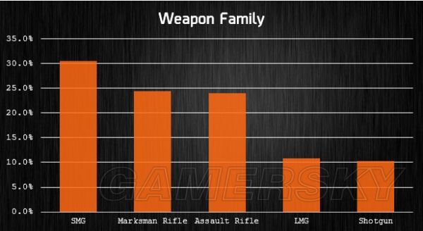 从上图你可以看见冲锋枪、狙击步枪,以及突击步枪明显是玩家的最爱,轻型机关枪与散弹枪则落后非常多。突击步枪拥有较高的射程以及较高的基础爆头伤害,让他们成为有效的武器。然而轻型机关枪与散弹枪则是明显的需要关怀。