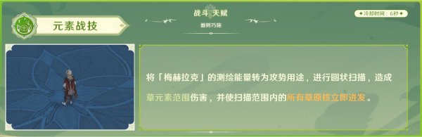施放E时,会在卡维脚下出现一个绿色的圆盘,然后卡维提着的那个手提箱(梅赫拉克)会以逆时针在圆盘中心转一圈,转完一圈后,若圆盘范围内有敌人,则会对敌人造成草元素伤害并施加草附着,若圆盘范围内有草原核,则会让草原核立即爆发。