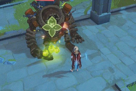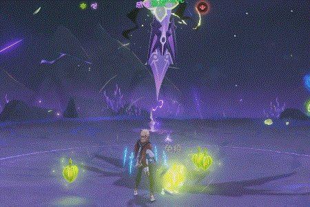 施放Q时卡维会右手拿手提箱向后一甩搭在肩上,随后立即创造出转瞬即逝的绿色立方体空间,若空间内存在敌人则会对敌人造成草伤并施加草附着,若空间内存在草原核,会使其立即爆发。