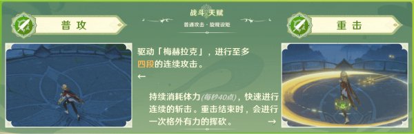 常态下的A、重击、下落攻击皆是白字物理伤害,实战中并不会常用,通过施放Q转换为草元素伤害后,便是主要的输出方式,但也只是A。重击与下落攻击都不常用,主要也是用于驻场持续挂草。A与重击的附着能力受元素附着CD影响,大约2秒(持续A/重击命中敌人,每2秒就会对敌人施加一次草附着),下落攻击为单独附着,每次下落攻击命中敌人都能施加草元素附着。
