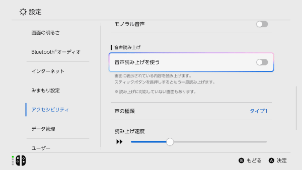 能把HOME选单或主机设定画面显示的内容以语音形式朗读出来。除了画面内的文字,也能朗读游标显示的位置等帮助操作的信息。语音的种类、朗读速度及音量均可设定。
