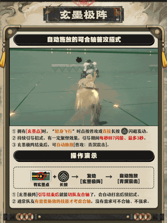 ① 玄墨极阵引导期间,如果在刚开始引导(约50帧前)闪避打断,则会导致后续伤害丢失。