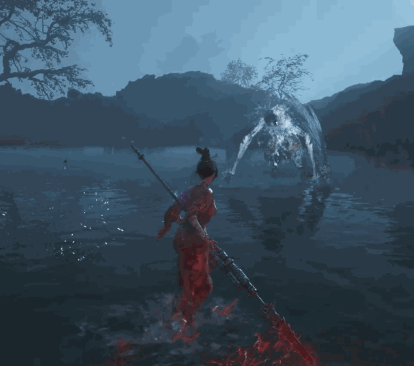 敌人半血后没有固定招式出现,但会新增一个新的横向水波,会横向连转2次,同时造成场景周围有小范围伤害。