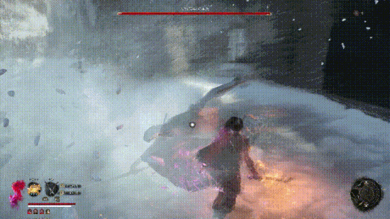 当看到Boss有明显的抬腿动作时,必须立刻闪避躲开、这一招无法被“抗衡”(拼刀),硬接伤害极高。切勿贪刀!