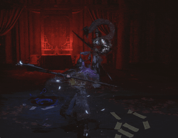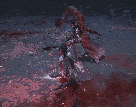 当须羽层数到达5层时,寻找机会使用【瞬息斩】立刻切换长枪释放【蒸汽绞链】,【蒸汽绞链】命中敌人时,敌人绝对会将后背暴露给我们并陷入僵直,此时立刻通过长枪的蓄力重击打出倒地,处决后切换回【青霜】重复这一套流程。