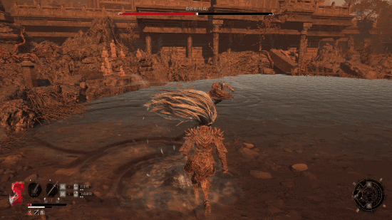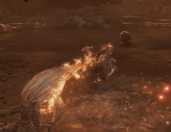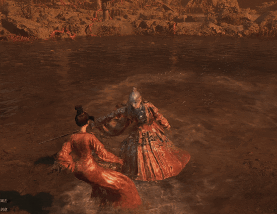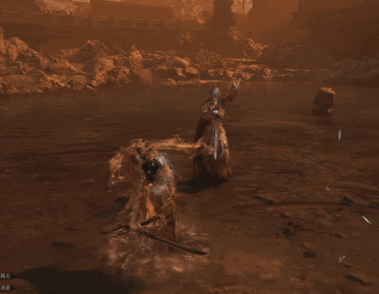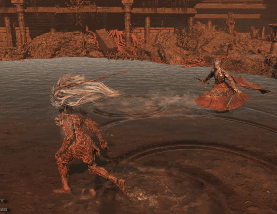 当红岚的剩余生命低于 6 成,她便会固定使出“奋力后蹬→斜向剑气 2 连发”,并转入二阶段。二阶段的红岚会使用二刀流,并解锁 各种剑气和霸体连段招式演示直剑突刺 :①侧身并平举持剑的右手 ;②右手反手持剑半蹲开场固定使用,距离远时也会固定使用,看到举剑掐好提前量闪避即可