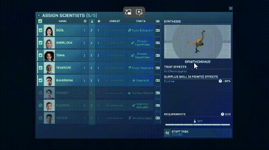 通过相关的游戏菜单选择你希望科学家完成的工作,包括研究、探勘、恐龙合成等。