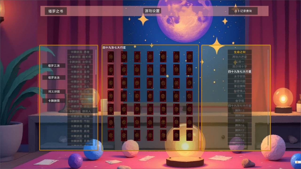 当月光浸透古卷,78张卡牌在暗纹绸缎上苏醒,每一道烫金纹路都藏着未解的谜题。《诗意塔罗牌》以水晶音阶重构占卜仪式——指尖轻触,水晶琴弦震颤,女祭司的吟唱与倒吊人的低语在耳畔交织成网。不同于传统卡牌的枯燥背诵,这里用十四行诗编织记忆锚点:当"恋人"牌浮现,沙漏中的星砂会逆流而上,而"死神"牌的叹息,竟化作凤凰振翅的尾音。在星象罗盘指引下,用韵律解锁每张牌的灵魂密码,让晦涩的象征意义化作可触摸的月光。