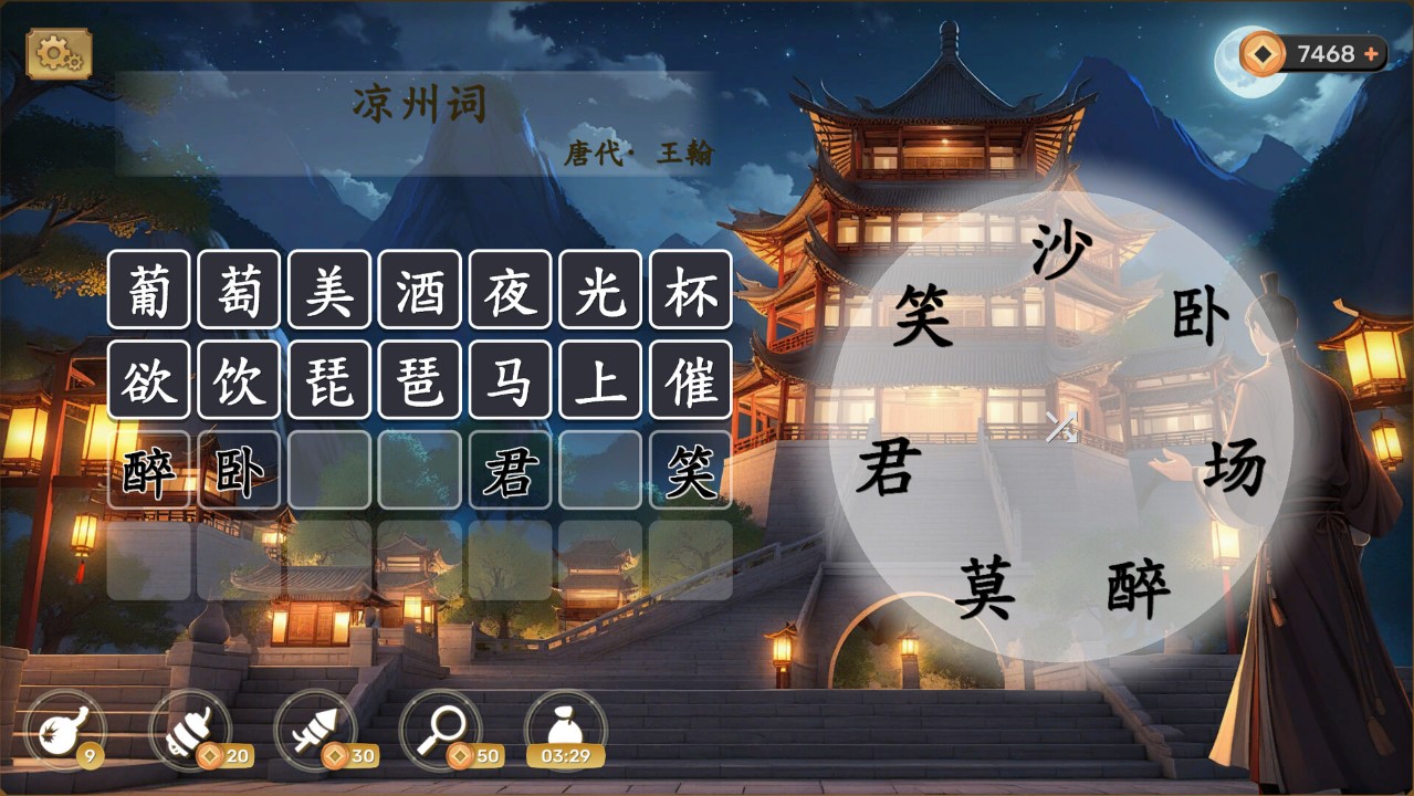 当千年诗卷化作旋转的星河罗盘,你的指尖就是唤醒沉睡文字的魔法棒~化身"寻诗小灵通",在三维立体画卷中腾挪跳跃,拖动三枚同韵汉字触发"诗意共振",看那山水画卷随诗句舒展,家国情怀在墨色中翻涌!别怕卡关,五种神秘道具随时待命——"灵感护符"能帮你锁定正确字块,"时光沙漏"让错选汉字原地复活!每日还有节日限定诗词等你解锁,元宵节拼出"火树银花合",七夕节巧遇"金风玉露一相逢",让传统文化在指尖跳起圆舞曲~