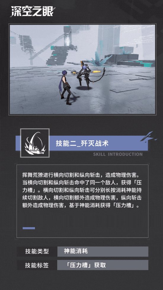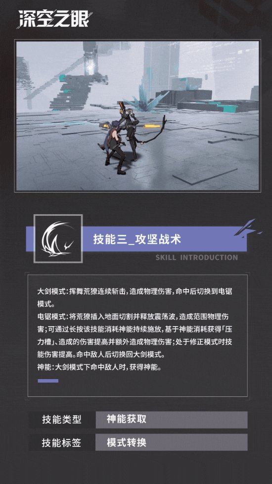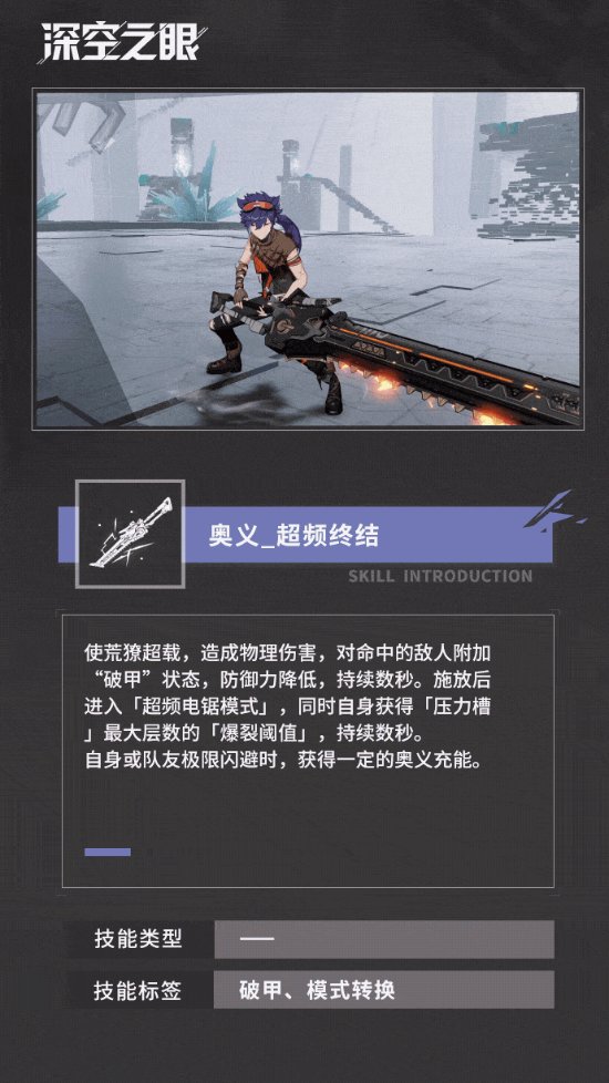 【设计思路】年轻的赏金猎人总是有些毛躁,攻击方式大开大合。手持「荒獠」的金固以爆裂之势攻击敌人,这把权钥有着大剑模式和电锯模式两种形态,在大剑模式下的攻击命中后,可通过长按对应技能进入电锯模式持续进攻。在积累特殊标记「压力槽」后,通过消耗「压力槽」带来特殊攻击,对敌人造成高额伤害。在释放奥义后可使敌人陷入“破甲”状态同时自身进入「超频电锯模式」,强化普通攻击并消耗神能,两者同时作用下能对敌人造成大量伤害。