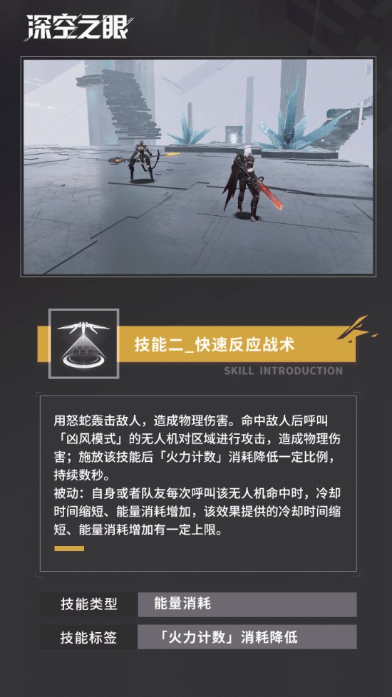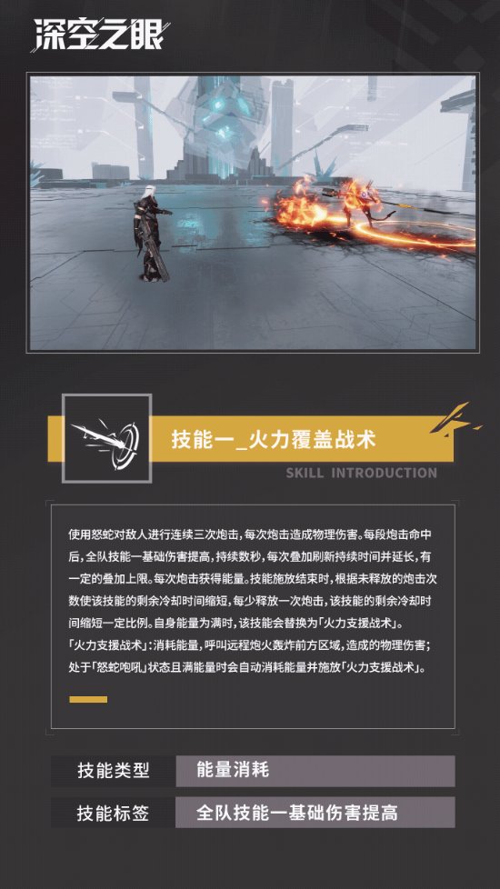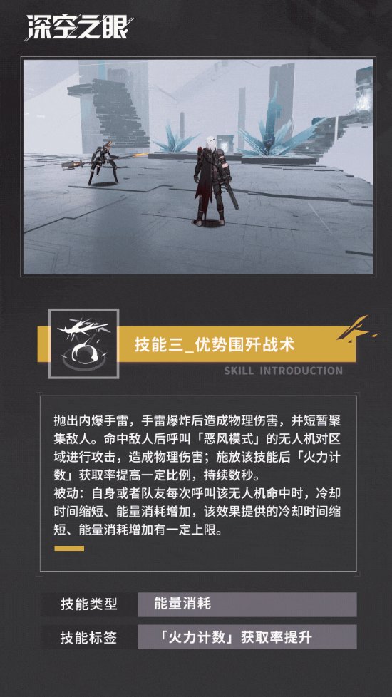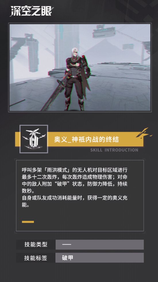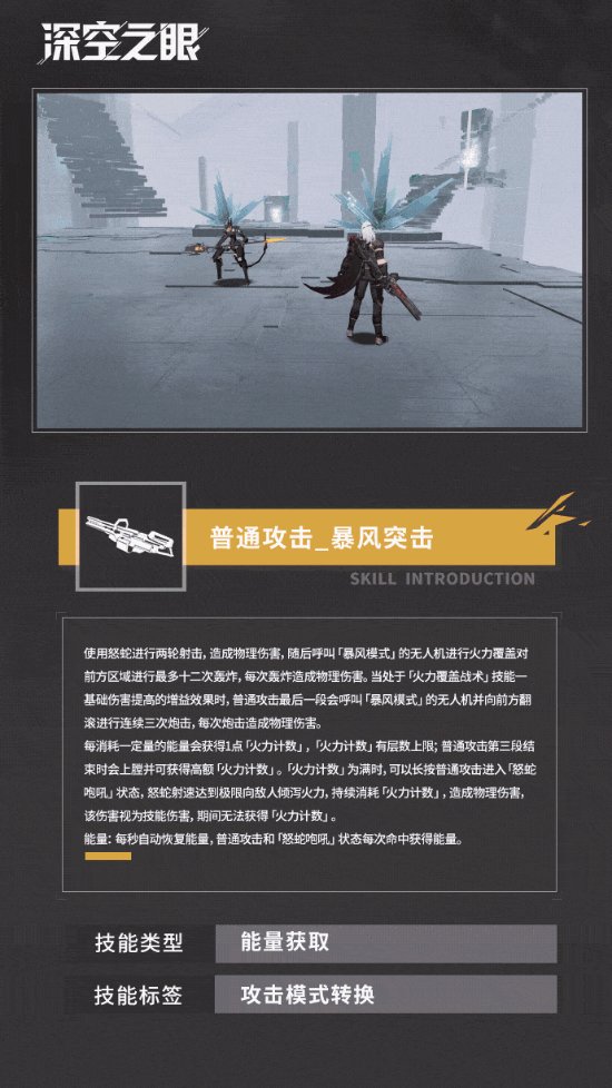 【设计思路】身为阿卡德公会的首领,马尔杜克和他那把陪伴了多年的权钥「怒蛇」一般,愈发老而弥坚。使用机枪战斗的他,能够以强大的火力压制敌人。积累特殊状态条「火力计数」后,满值下就可以进入「怒蛇咆哮」状态,更为极限的倾泻火力。拥有军事背景的马尔杜克也有着深厚的战术素养,无论是召唤无人机打击敌人,或是转而辅助队友进攻,对他来说都不在话下。