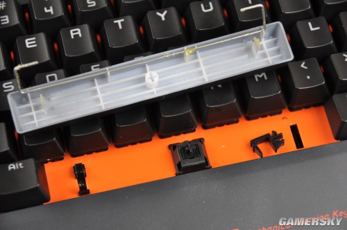 平衡杆,作为机械键盘中比较容易干燥的平衡感,雷柏使用了黄油最为润滑使用,这在正常情况下是比较少见的,另外平衡杆的支撑则是使用了龙船型的卡扣。