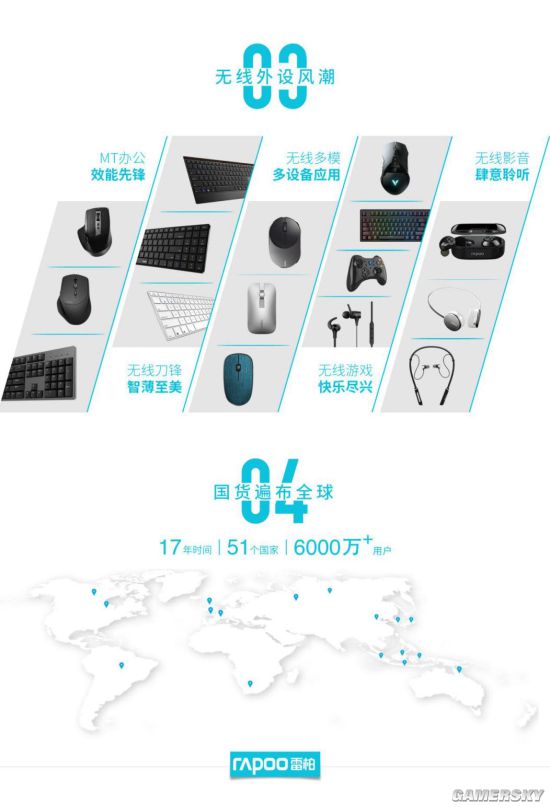 辅以严谨的技术与严苛的测试,精湛设计打造产品。雷柏产品遍布全球51个国家,为超过6000多万消费者提供智能化、专业化、全面化的服务,连年受邀参加美国CES、德国IFA等全球性消费大展,绽放中国智造力量。