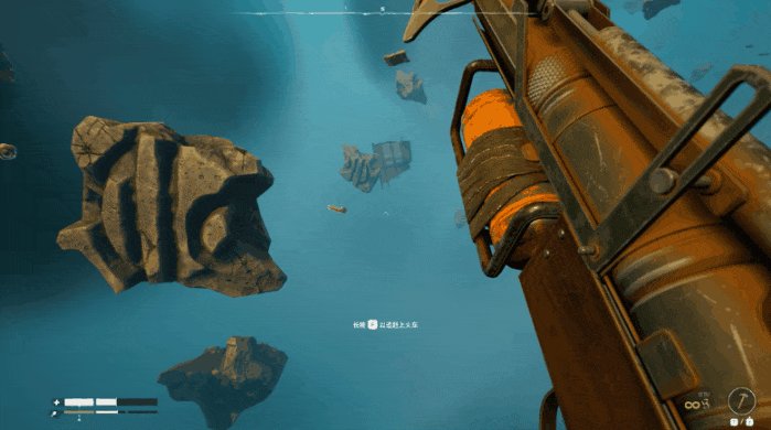 等到游戏中期你做出抓钩枪,就能用它来远程捡垃圾了。虽然,它的射程并不像《Raft》中那样长,但它的飞行速度更快,还没有耐久设定。用抓钩枪捡垃圾的体验不仅高效,命中目标时叮叮当当的声响也十分解压。可以说,至少《虚空列车》收集资源的底层玩法体验,是做得还不错的。