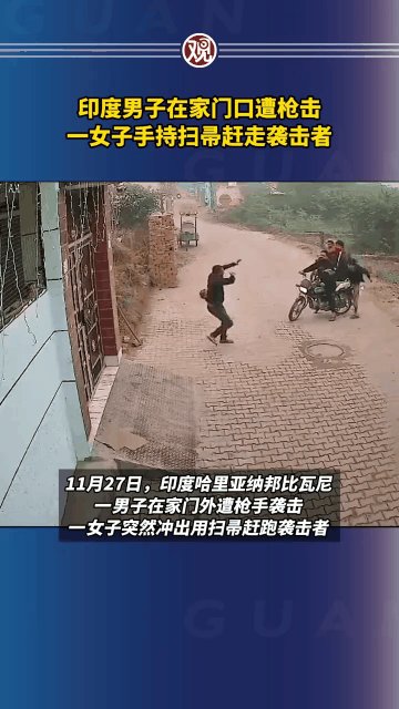 近日,印度哈里亚纳邦,当地一男子在家门外遭枪手袭击,一女子突然冲出救了他们。
