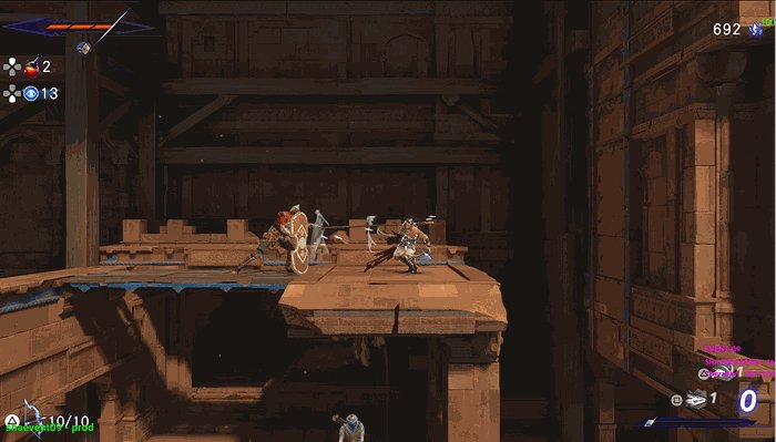 在试玩《失落王冠》的过程中,令我满意的不只有地图和关卡设计,也包括流畅、顺滑的连招动作系统。与当前大部分难度和手感都向“类魂”靠拢的银河城游戏不同,本作角色的攻击和行动都相当灵活。你几乎可以像在《鬼泣》中那样打出各种酷炫的连招:在地面连段中加入挑空开始一段“皇牌空战”,甚至可以用一些独特的技巧控制敌人的滞空或落地,还能用特殊动作取消后摇,将原本接不上的攻击连起来。