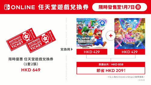 香港任天堂今日发布提醒,港服「任天堂游戏兑换券」(任亏券)的限时发售即将于1月7日23:59截止,感兴趣的玩家可前往购买。