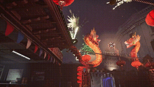 年味要浓,首先场景氛围要足,新春版本即将上线的“红龙街区”就布置得极具春节特色:浓厚的中式街区风格,其中随处可见春联福字、龙形花灯、挂上大红灯笼的中式牌楼、喜庆的石狮和鞭炮摆件还有绚烂的烟火盛会等传统春节必备场景,可以说是真正的年味十足,在这个区域执行任务都颇有一种新春逛庙会的喜庆感,氛围感拉满。