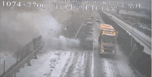 一辆12米长的黄色工程车辆在高速公路上作业,车辆两侧喷管源源不断喷出高速热流,所过之处,路面积雪全部被“一吹而空”,除雪效率极高。