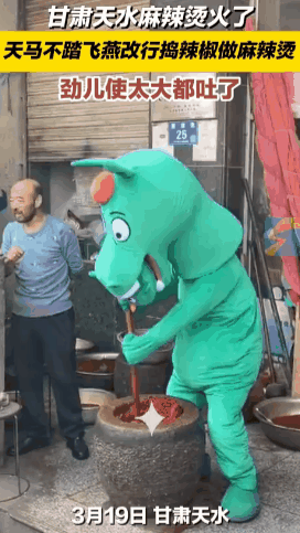可以看到捣辣椒这边加了不少人,还有穿着“马踏飞燕”人偶服的人正疯狂捣着辣椒,叼在嘴里的“飞燕”掉了都没空管。捣完辣椒还接着做麻辣烫,可忙坏了。