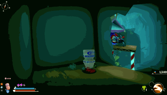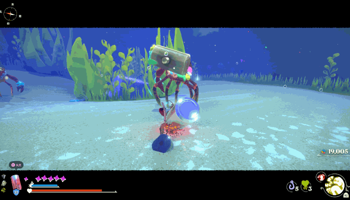 《蟹蟹》的地图采用了非常典型的立体箱庭架构,在设计上提供了非常多探索乐趣。例如,利用磁吸平台的吸引力,使佩戴金属外壳的主角进行区域间移动;或是借助可发光甲壳的能力,在漆黑的海底进行探索。一些隐藏道具的位置,更是需要先通过一些严苛的“跳跳乐”关卡才能触及。