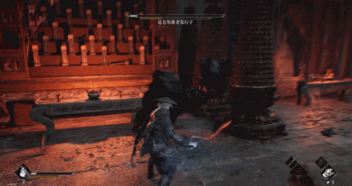 比如利用能造成硬直的影之武装,打断对方的前摇蓄力;也可以借助地形元素,利用殿内的顶梁柱飞檐走壁先发制人;再或者,你也可以通过最基础的闪避鬼步机制,在血滴子落地的一瞬间施展鬼步、随后开始华丽的表演。