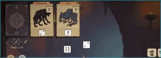 骰子是本作的基础机制,所有战斗的核心循环是每回合掷骰子并选择如何最好地利用它们。玩家需要骰子的点数满足特定要求,才能将敌人翻面送下场。作为最基本的资源,随着玩家深入地下城,每回合可用的骰子数也会随之增加。玩家每回合可以选择将全部骰子打出去,抑或是保存最多三个骰子留待后续回合在使用。然而,想要深入地牢,绝非点点鼠标扔出骰子那么简单。击败怪物需要满足各种具体的条件,有些怪物要求骰子数值的总和,有些可能限定在特定点数或奇偶数,有些或许对点数没有需求,但却要求你交出三个骰子才能乖乖变成卡背。此外,屏幕右侧的槽位如果凑齐1-6的全部固定点数,则会奖励玩家一枚金币,可用来在流程中换取诸多强力增益。若选择暂且保留点数资源或拿去置换经济,就可能要付出生命值作为代价。