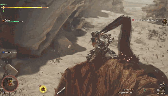 来到辟兽逃往的位置,在一次精准的跳跃攻击命中后,猎人直接跳上了辟兽的背部,进入了骑乘状态。本作的骑乘攻击设定与《怪物猎人:世界》类似,骑上怪物后可使用匕首或武器进行攻击。不同的是,用匕首攻击后会在怪物的对应位置产生伤口,此时再用武器攻击,便可触发终结动作并产生伤口破坏效果。