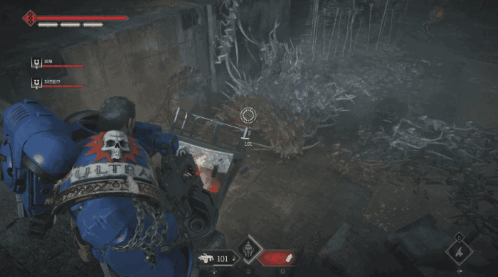 同时,《星际战士2》对前代中近战无脑“处决回血”的机制进行了调整。角色的血量除了靠消耗品和主动技能回复外,还新加入了一个“限时回复”的机制。简单点说,当玩家的护甲损失殆尽,并受到攻击后,血条上会出现一段从原血量不断衰减,并最终回到当前血量的白色计量条,在衰减的这段时间内击杀敌人,便可以回复血量,直到计量条与当前血条重合。