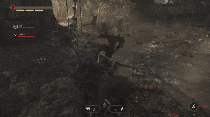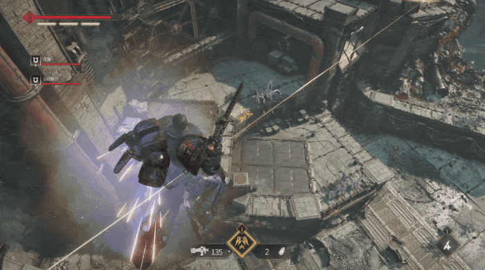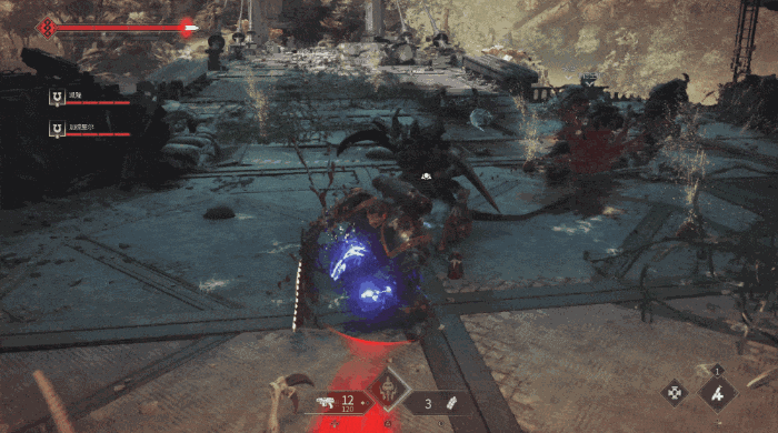 此外,战斗中敌人会出现橙红色或蓝色的特殊攻击提示,此时玩家需要分别按下闪避与格挡键,进行躲闪与类似“弹反”的操作。如果发动特殊攻击的是小型敌人,那么在弹反后,它们就会被立刻处决,并为玩家恢复护甲值。如果是体型稍大的敌人,那它们就会出现一个特殊的远程攻击提示,此时按下远程攻击键,便可以追加一发特殊的“枪袭”,造成大量伤害,如果敌人因此被击杀,那么玩家同样也可以恢复护甲。