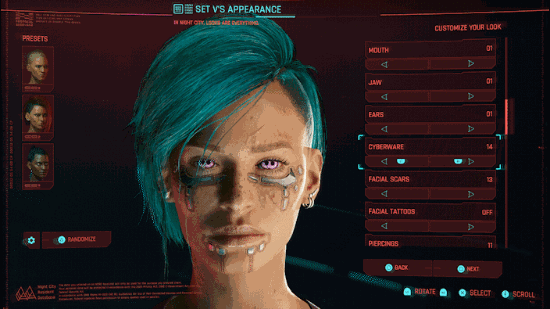 ·升级后的人物创建随机生成器新增了朋克程度滑动条。现在无论是低调的休闲风,还是大胆的前卫时尚,都可以通过滑动条让你的V达到完美的平衡。