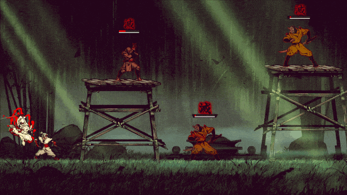 在密林当中,敌人从四面八方袭来,但均被主角的苦无一击必杀,此时,从天而降的偷袭也被察觉,你拔出武士刀在顷刻之间分出胜负。人头点地,主角没有一丝迟疑,从未停下疾奔的脚步,直达敌人巢穴。