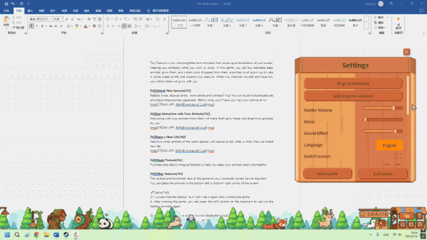 这是一群在你工作/学习时睡觉、挠痒痒、乱跑(放心,不会跑到你的工作区域)的小动物。假如你善于经营,它们会越来越多,直至用不同种类与花色霸占你的屏幕底部。当然,如果你能多摸摸它们并且给它们喂点吃的,那就更好了。