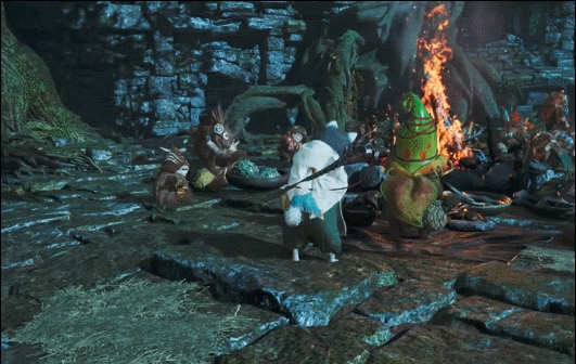 例如作为玩家伙伴的艾露猫,在不同场景下会与当地的环境和生物进行全然不同的互动。比如在森狸人之家里,艾露猫会参与它们的神秘仪式,到达风音村后,又会与鹭鹰龙幼崽嬉戏打闹。