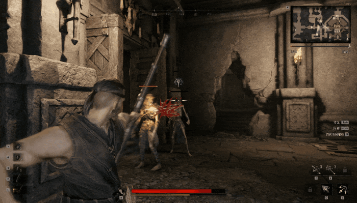 而作为远程武器,弓箭则提供了另一种层面的“爽”。它使用起来灵活轻巧,虽然没有动作取消,但较短的前摇却也保证了动作操作反馈上的快速与及时性,让玩家面对敌人出乎意料的攻击时也能及时闪躲。不过,灵活并不意味着弓箭多么“娇弱”,无论是蓄力拉弓,还是职业自带的蓄力大招,也都在画面与音效表现上拉满了弓箭的力量感表现。而且,弓箭打到敌人的头部也会令其出现明显的硬直表现,精准的受击反馈让攻击变得更具实感。