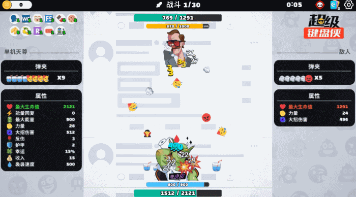 每战胜一名敌人,都会获得能力选择机会,同时根据收入数值,获得金币。战胜BOSS之后,会有“抗压神器”可以选,每种抗压神器,都有特殊的效果。之前提到的突发事件,在选择后,也会有对应的神器。