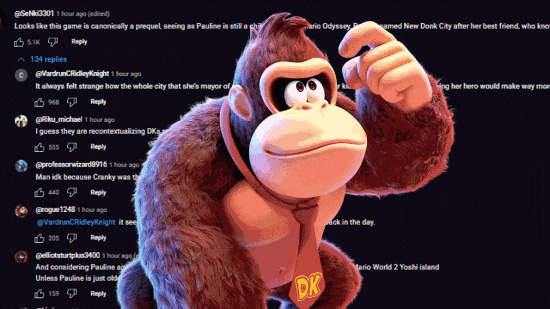 外媒Kotaku发文表示,熟悉系列设定的老玩家都知道,Cranky Kong早年在1981年的街机游戏《Donkey Kong》中被暗示为初代大金刚——也就是绑架成人版宝琳的元凶。因此,在《蕉力全开》中看到年幼宝琳与明显年迈的Cranky同框,引发了设定上的巨大矛盾。一时间,Reddit、YouTube等平台上涌现出大量玩家留言,尝试拼凑时间线、推理设定逻辑,甚至出现了一篇1300字的长评论,试图将《蕉力全开》融入《马力欧》和《咚奇刚》的完整宇宙时间轴中。