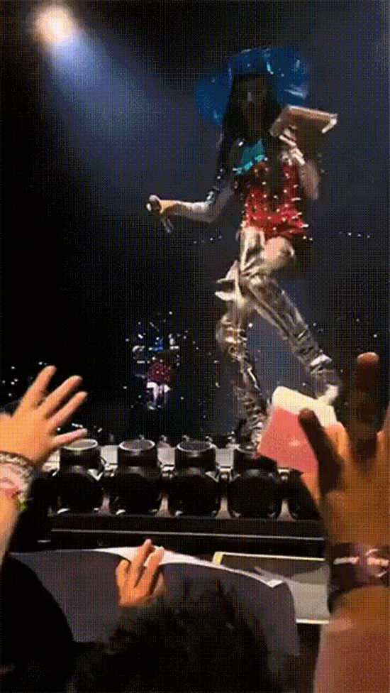 事件发生在水果姐凯蒂·佩里(Katy Perry)近期在澳大利亚珀斯演唱会(PERTH NIGHT 1)的粉丝互动环节中,一名台下观众向舞台递出潮玩品牌泡泡玛特旗下IP Labubu玩偶。